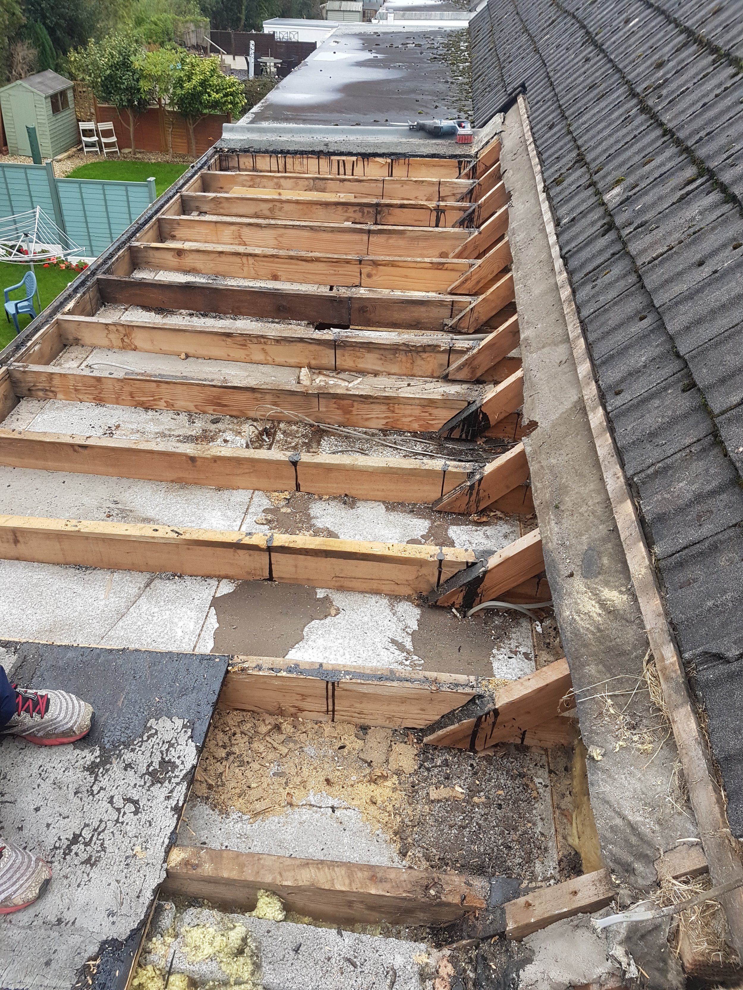 Yes. The existing roof covering and any rotten decking are fully removed before the new OSB3 deck and EPDM system are installed.